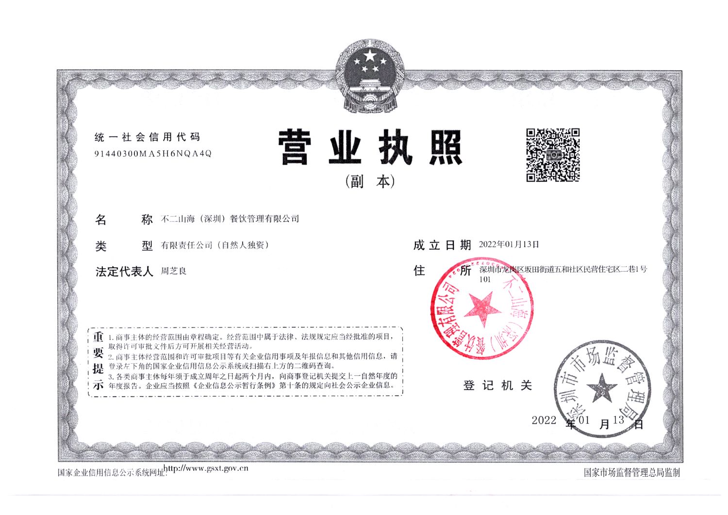 不二山海(深圳)餐饮管理有限公司